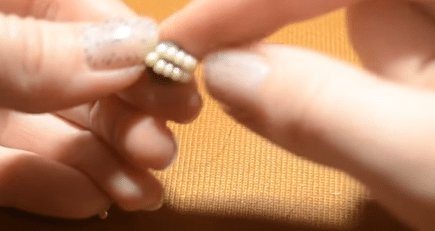- Наберите на проволоку три бисеринки, протяните её через бусины предыдущего ряда, а затем через три набранные. Так у вас получится третий ряд.
