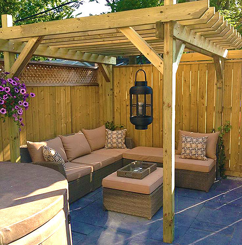 Идея оформления уголка отдыха около забора сразу решает вопросы стен — их функцию прекрасно выполняет ограждение. Вам остается только подготовить площадку, расставить дачную мебель, возможно, установить навес или перголу.