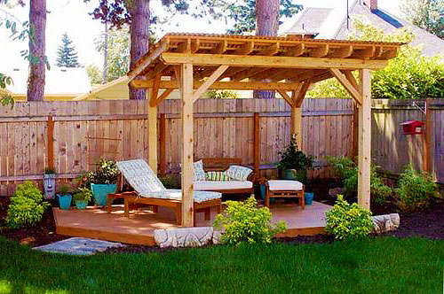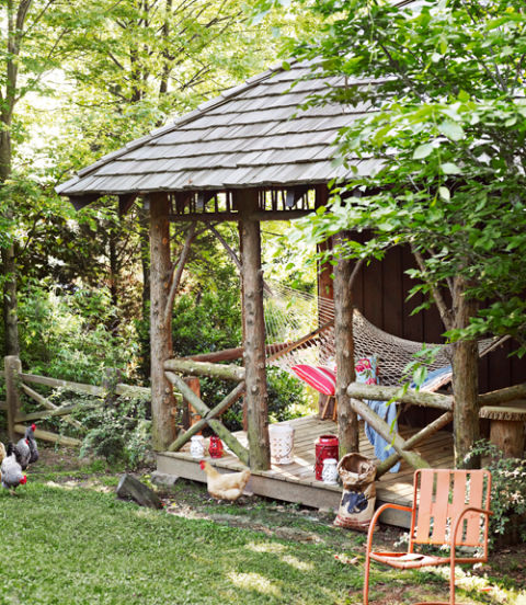 Беседка, сконструированная из излишков стройматериалов. Спрятанная в тени деревьев или вьющихся растений, ярко раскрашенная, снабженная мягкими подушками на скамейках, она позволит забыть о суете и шуме городской жизни.