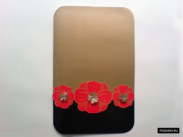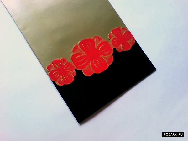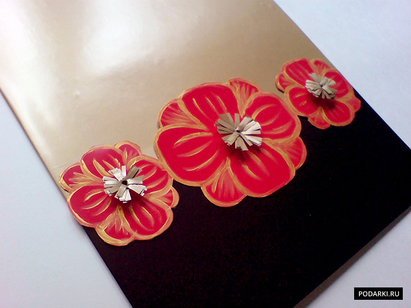 После этого вырезаем полосу красного цвета, по ширине размером с открытки. На ней нужно нарисовать три цветочка, один крупнее в центре и два поменьше по бокам. В данной работе был использован золотой акрил, наносился он тонкой кистью.