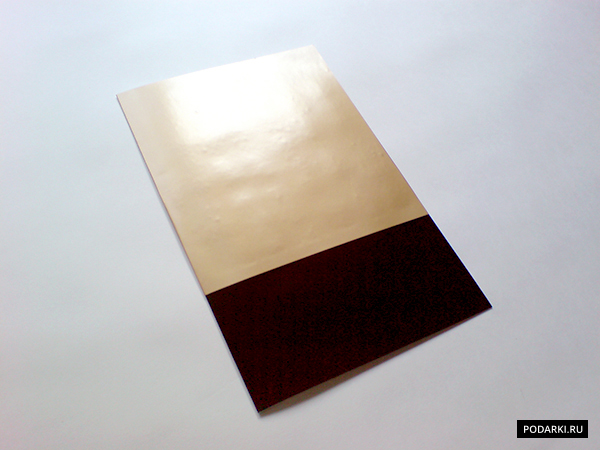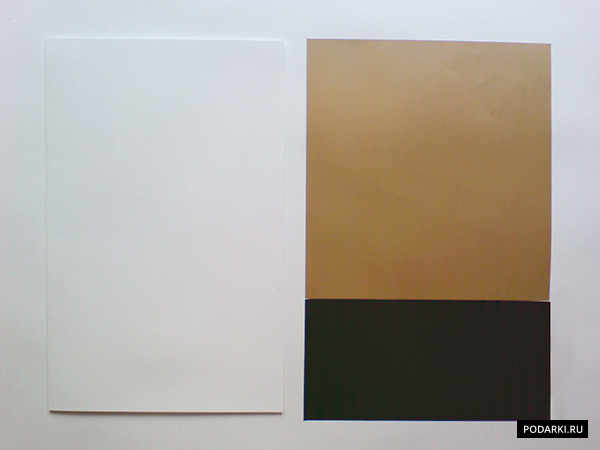Берем картон и сгибаем его пополам, отмечаем границу, на которой встретится бумага черного и золотого цвета. После чего отмеряем и отрезаем соответствующие размеру детали.