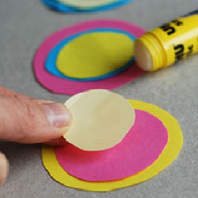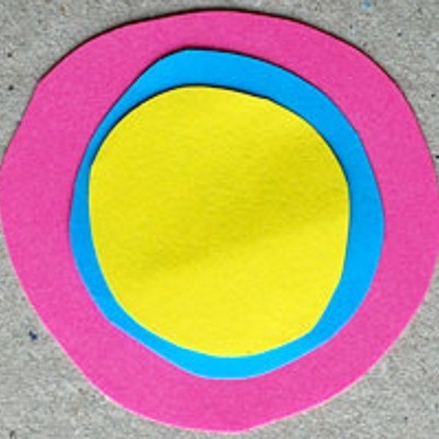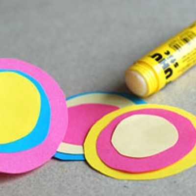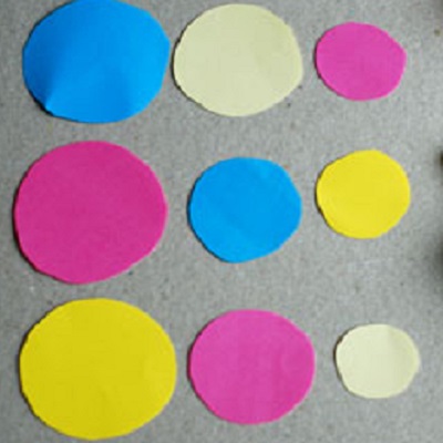Берем разноцветную бумагу и вырезаем девять кружков разного диаметра, по три штуки каждого размера.