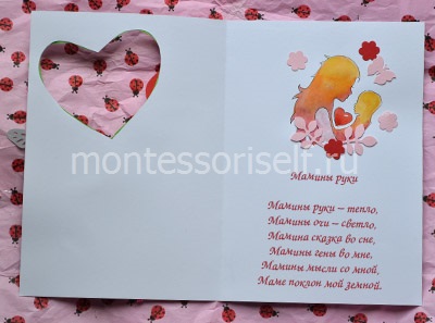 Внутри на уровне вырезанного сердца приклеиваем или рисуем рисунок мамы с младенцем и сердце, как на фотографии ниже.