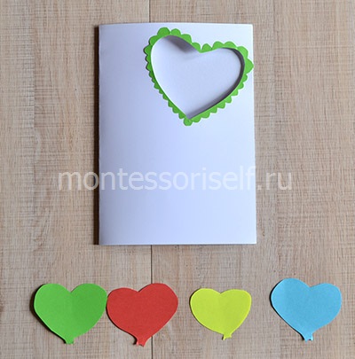 Берем плотный лист бумаги и сгибаем его пополам. После этого аккуратно вырезаем на передней стороне отверстие в форме сердца. После чего украшаем бумагой зеленого цвета по контуру, как на фотографии ниже. И еще вырезаем четыре сердца из бумаги желтого, красного, зеленого и голубого цвета.