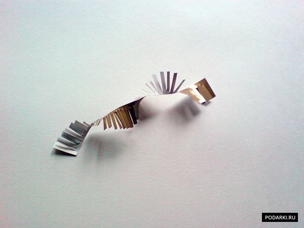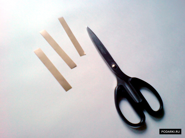 Остается только сделать объемные серединки для цветочков. Возьмем бумагу золотого цвета и отрежем три тонких полоски.