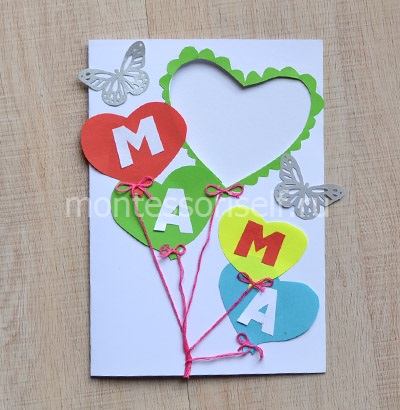 После этого все сердца клеим на открытку. Вырезаем из бумаги контрастных цветов буквы, составляющие слово «мама». И клеим их отдельно поверх сердец. После чего берем нитку и, имитируя ленточки от воздушных шаров, приклеиваем их к сердцам. Вырезаем бабочек из бумаги и украшаем ими открытку.