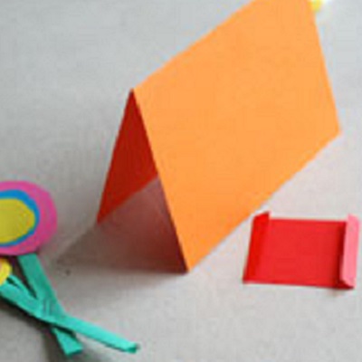 Разрежьте лист картона пополам, не доходя несколько сантиметров до края бумаги. Сложите одну половину «домиком», а вторую — в виде «гармошки», украсьте на своё усмотрение, дополните гвоздиками-оригами: