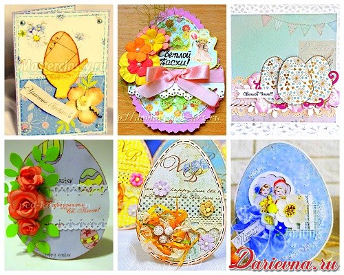 А такие замечательные открытки можно сделать в технике скрапбукинг к Пасхе.