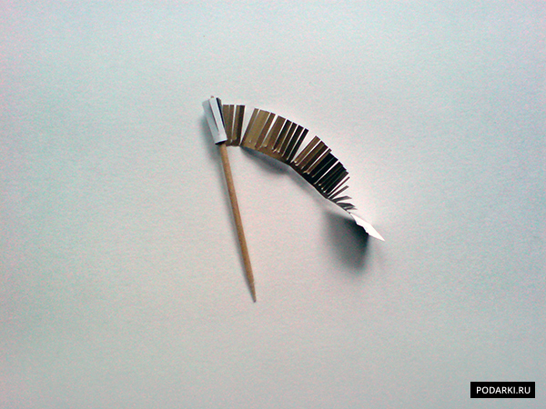 После этого берем зубочистку и закручиваем вокруг нее полоску с бахромой так, чтобы цветная часть была внутри.