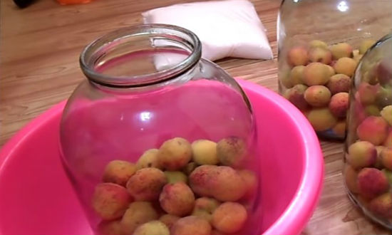 - Трёхлитровую банку наполняем на 1/3 плодами абрикосов.