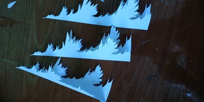 Домики вырезала из белого картона от обувной коробки (с такого картона удобнее всего вырезать, Да и цвет менять не надо), елочки вырезала из обычной бумаги “Снегурочка”. Перед тем, как выставить домики, я приложила гирлянду. Вся работа заняла дня четыре, не более.