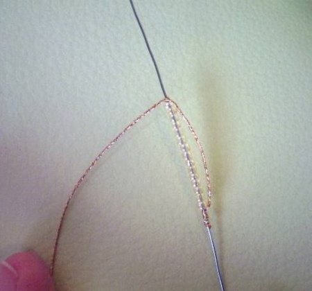 - 3 ряд: На правый кончик проволоки нанизываем 3 бисерины, берём левый кончик, пропускаем его через три бисеринки на правом кончике проволочки, потом затягиваем.