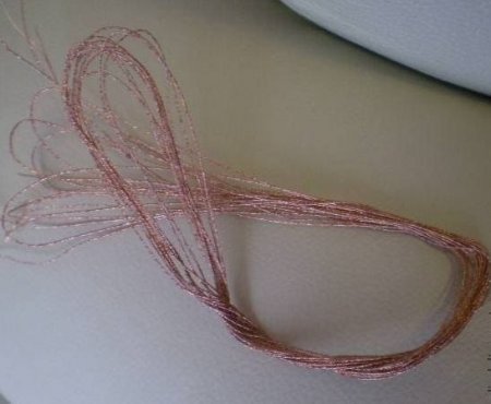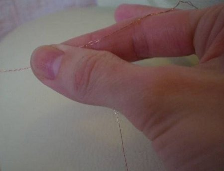 Надо разделить нить мулине на тончайшие ниточки, затем, на каждом конце, надо завязать узелок. После чего, начинается процесс скручивания мулине и проволоки.