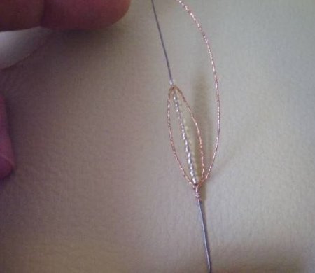 Затем концы проволочек скучиваем вместе. Теперь к этой половинке листика нужно приплести точно такую же половинку.