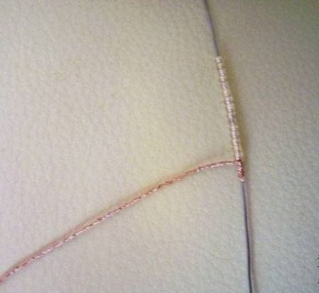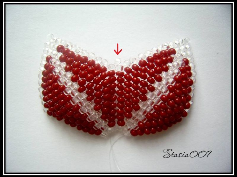 - Шестая дуга не обвивается вокруг основы, а, отступив сверху 10 белых бисеринок, проволока просовывается через предыдущий ряд с изнаночной стороны на лицевую.