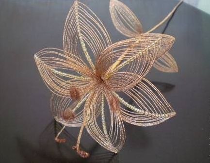Верхнюю часть основы проволоки, надо загнуть вовнутрь лепестка, очень аккуратно, что бы лепесток нравился. Данное действие надо повторять то количество раз, пока не выйдет нужное количество лепестков. После достижения нужного результата , нужно соединить лепестки проволокой, а в центр прикрепить тычинку.