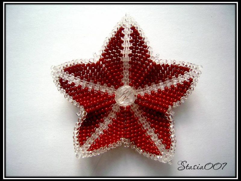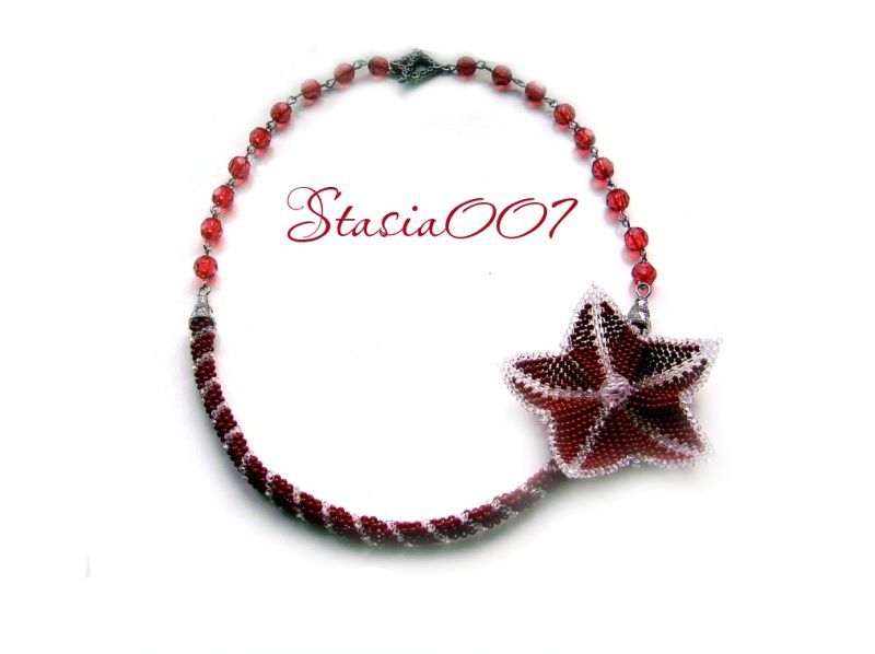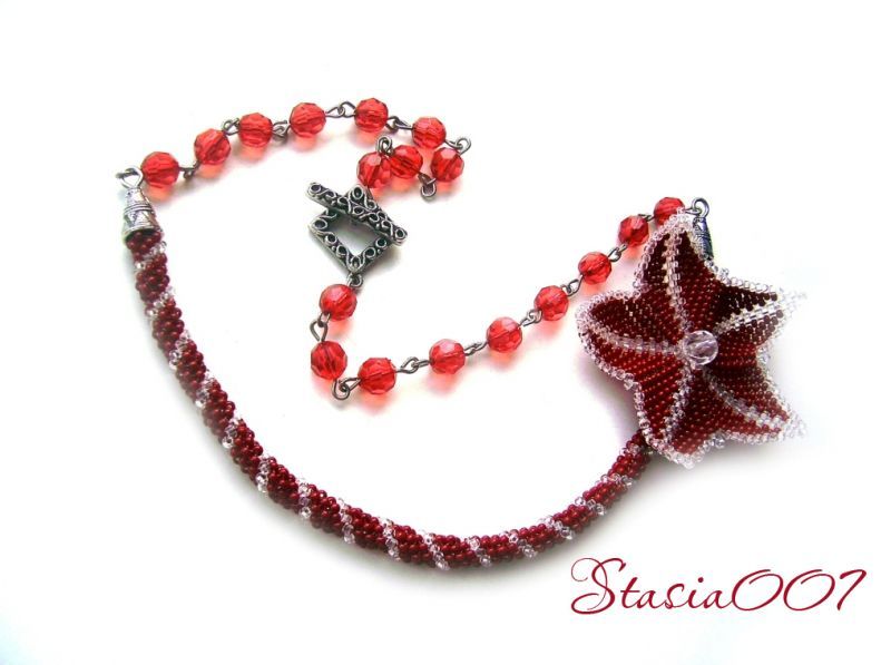 красный и прозрачный бисер, игла, леска.