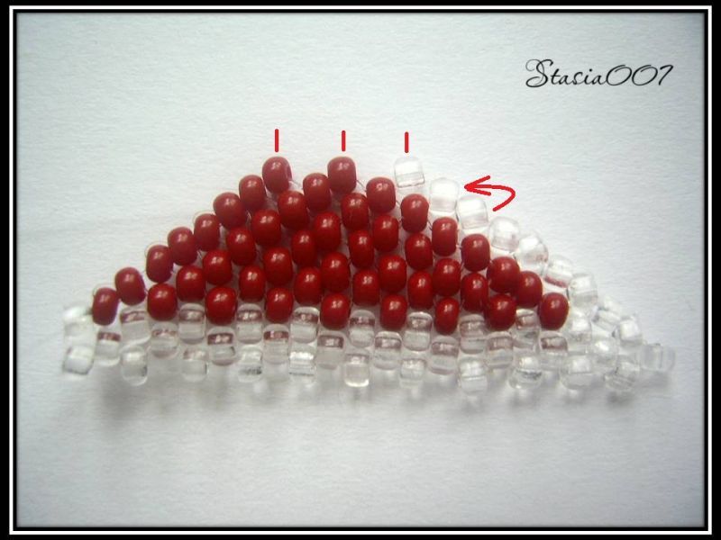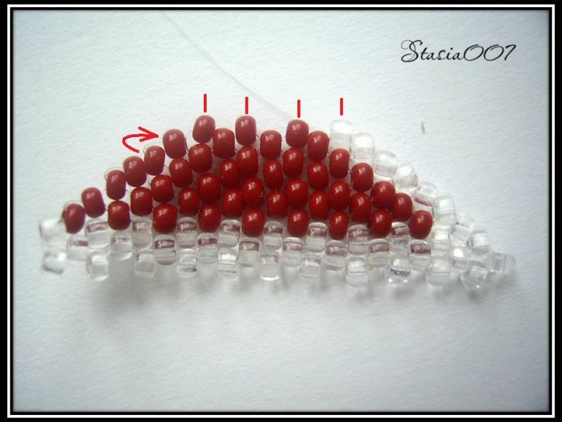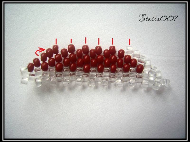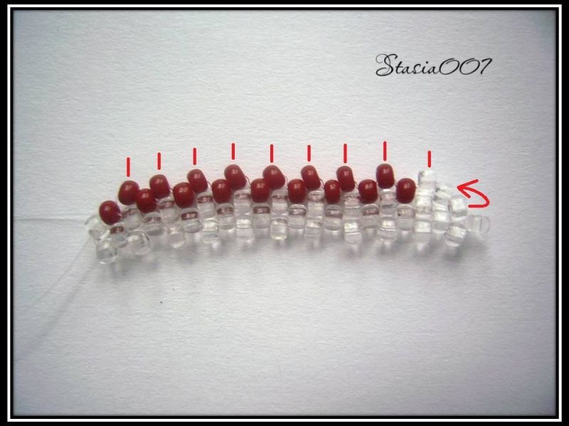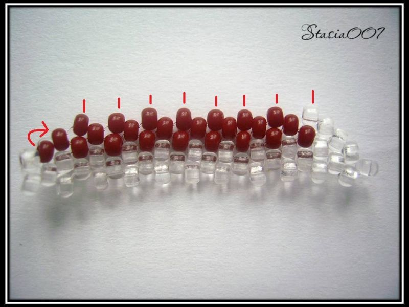 8.Плетем красным бисером до предпоследней прозрачной бисерины в цепочке, последнюю делаем прозрачной. Поворачиваем и выходим из последней красной бисерины: