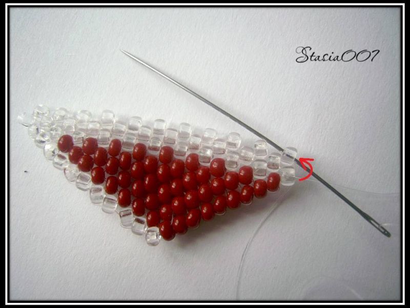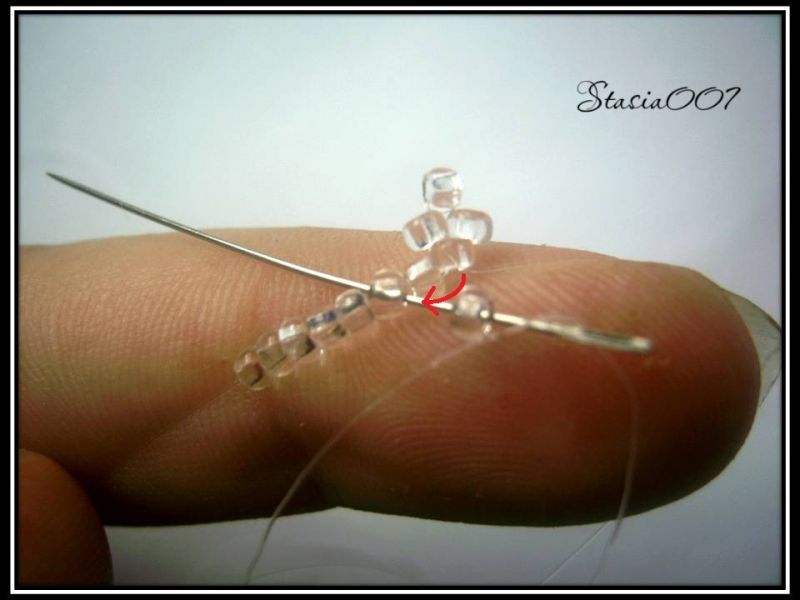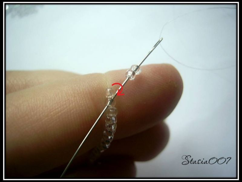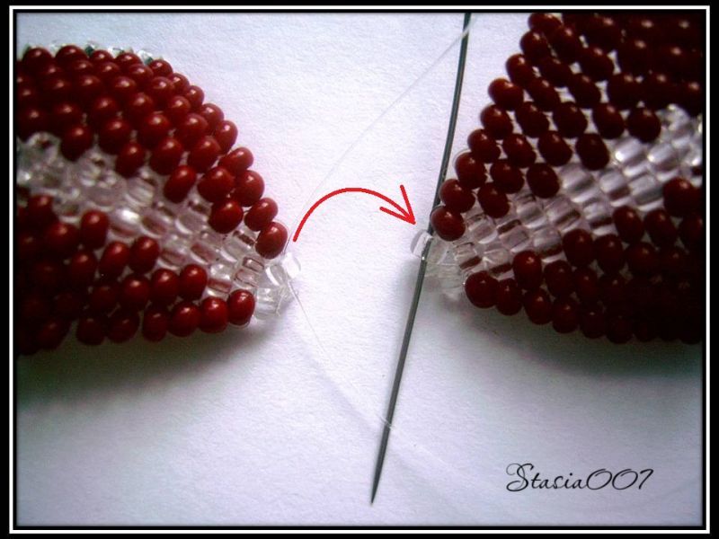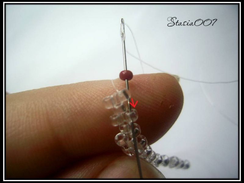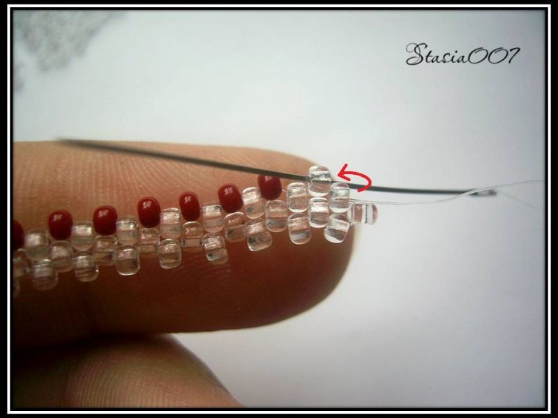 7.Набираем 1 красную бисерину и проходим в прозрачную бисерину: