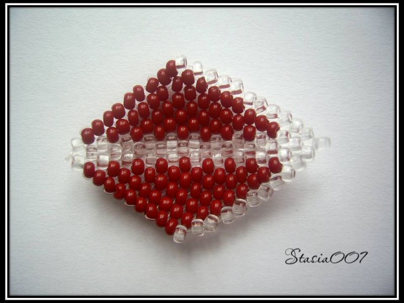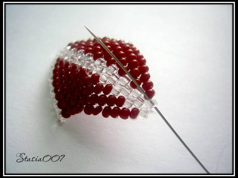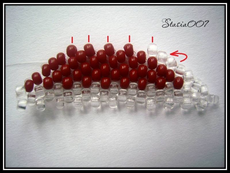 9.Так же плетем следующий ряд -1 прозрачная, остальные красные: