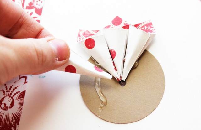 5) 10 кругов помещаются на 10 белых картонных заготовок и закрепляются с помощью двустороннего скотча. Причем с обратной стороны получившейся детали так же необходимо наклеить двусторонний скотч для того, чтобы удобно было клеить поделку на стену;