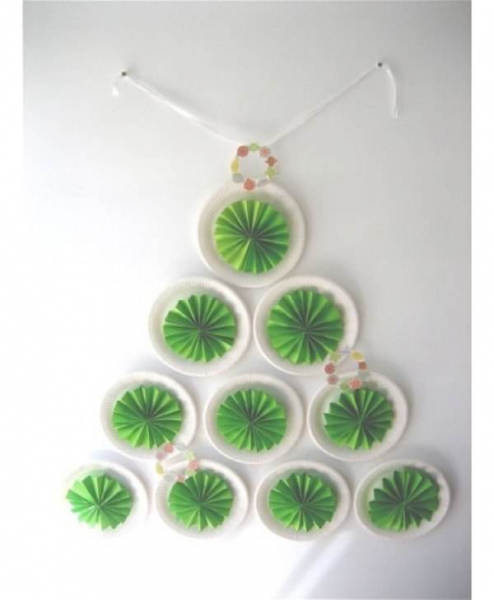 Если мастерить такую елку, как на картинке, то понадобится 20 листов зеленой бумаги и 10 тарелок или белых картонных кругов. При желании елку можно сделать больше или меньше.