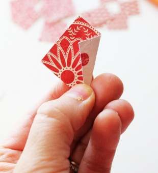 1) Необходимо вырезать 14 квадратов из картона размером приблизительно 2,5 см, а из листа картона с другим цветом или орнаментом понадобятся также 14 квадратов шириной 3 см.
