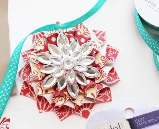 6) Можно оставить снежинку в таком виде, а можно использовать стразы, блестки и украсить центр изделия. Такими снежинками можно нарядить елку или повесить на стену, достаточно привязать или приклеить тесьму.