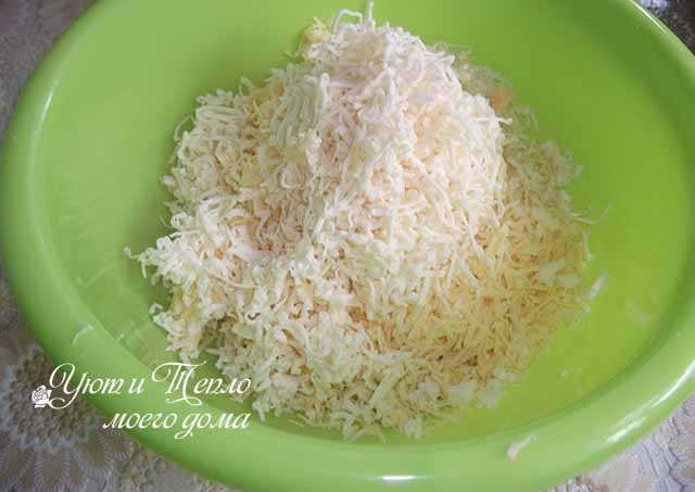 Шаг 2. Сыр (твердый и плавленый) и белки яиц натереть на мелкой терке в.