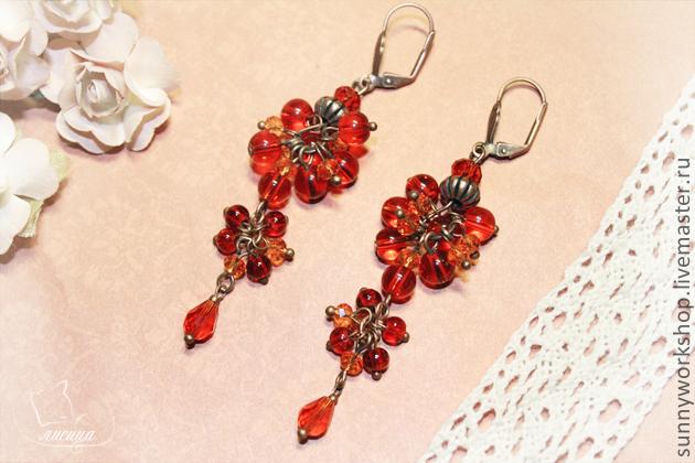 Я очень люблю длинные серьги, но тонкие и некрупные. Однако многие девушки, как показывает моя практика, предпочитают массивные украшения. Я долго думала, как совместить свою любовь к тонким изысканным вещам и популярность крупных украшений. В итоге мною был выбран каскадный принцип, где тонкие соединительные элементы сочетаются с крупными связками бусинок. Вдохновением для создания сережек, как я думаю уже видно, послужил ярко-красный, с всполохами оранжевого, огонь.