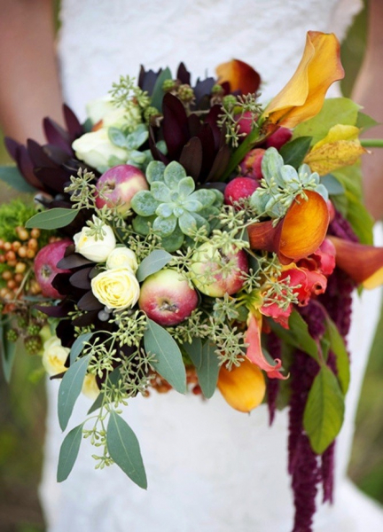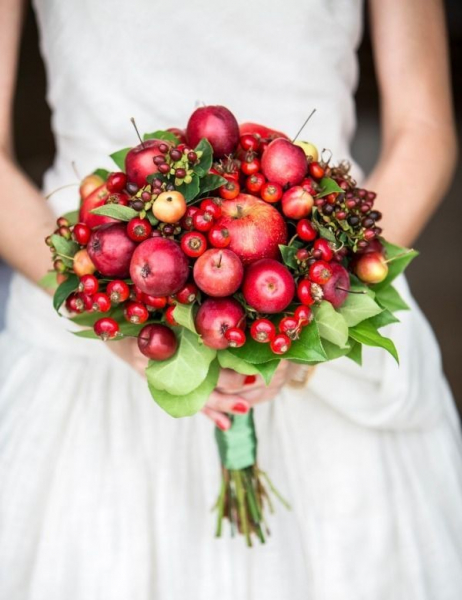 Очень важный аксессуар для наряда невесты – свадебный букет. Совсем не обязательно делать его из одних живых цветов. Для оригинальности можно добавить овощей и фруктов, тогда получится съедобный свадебный букет.