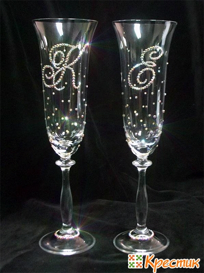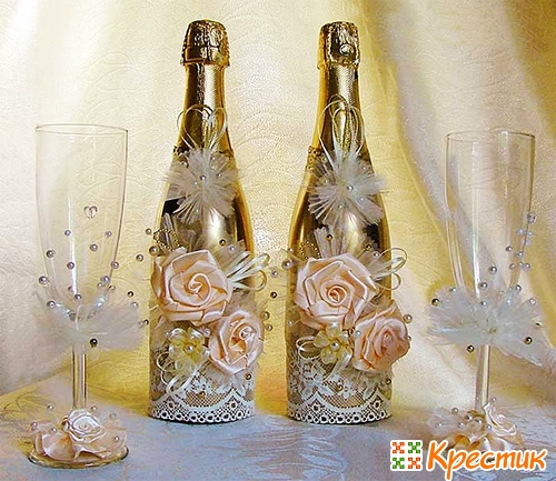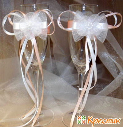 Очень большой простор для фантазии предоставляют ленты и кружева. Ими можно обмотать ножки бокалов, приклеить на сами бокалы красивые банты, украсив их бусинами и камнями.