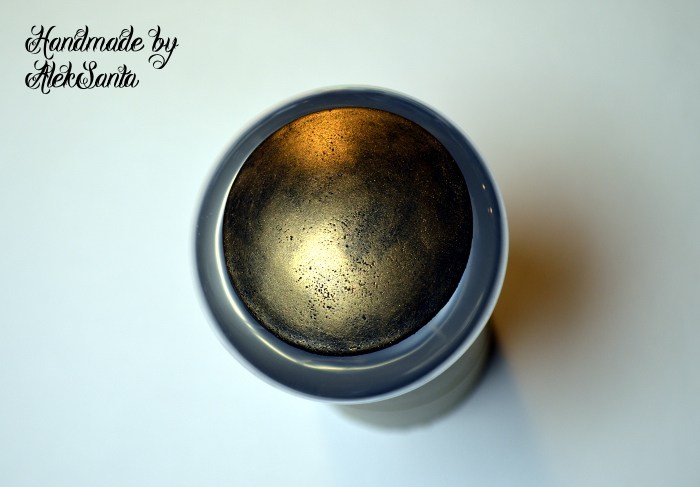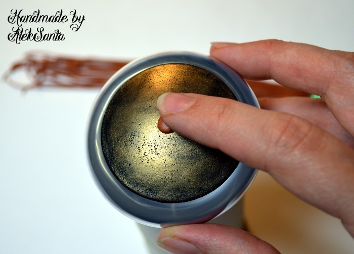 Готовим основу и помещаем ее на выпуклую поверхность. Я вырезала круг из раскатанного пласта полимерной глины, слегка текстурировала его щеткой и натерла металлической пудрой. Я не останавливаюсь подробно на изготовлении основы, поскольку она может быть любой в соответствии с вашими идеями. Можно немного смазать основу гелем (жидкой пластикой).