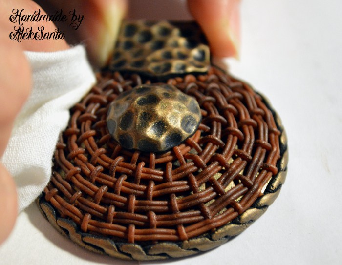 После запекания добавляем несколько элементов декора на наш кулон. В нашем случае были добавлены центральная полусфера, узорный бордюр и элемент крепления тесьмы. Все тонировано металлической пудрой, сама плетенка немного оттенена масляной краской.