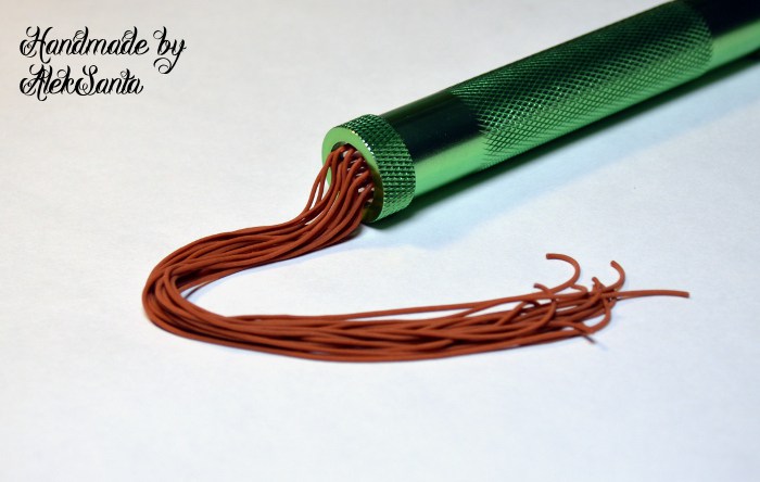Из оставшейся полимерной глины при помощи экструдера или вручную делаем несколько “колбасок” одинаковой толщины. Прокатываем их через паста-машину или слегка придавливаем другим инструментом, чтобы они стали более плоскими.