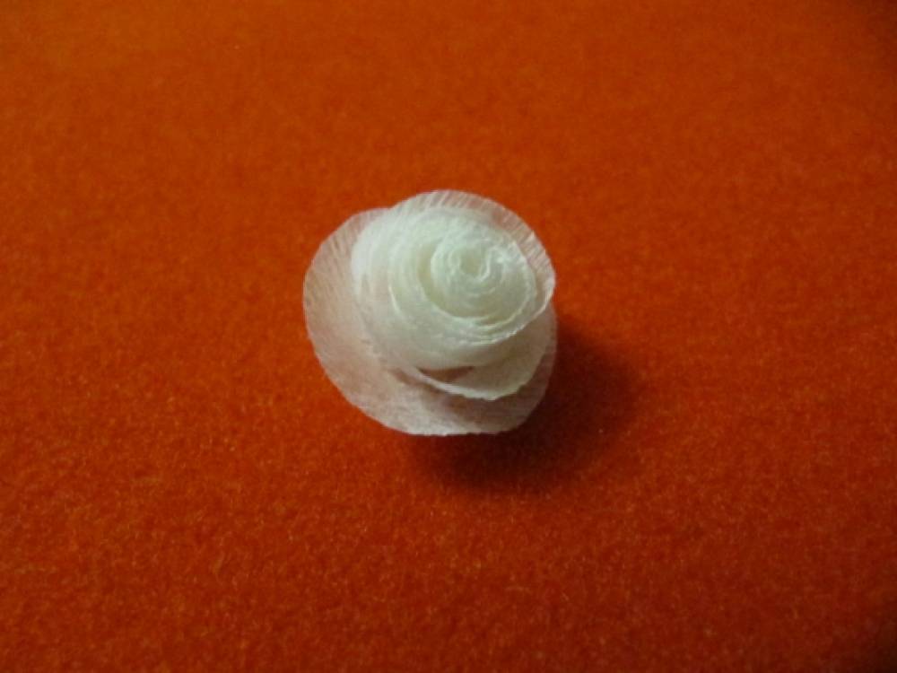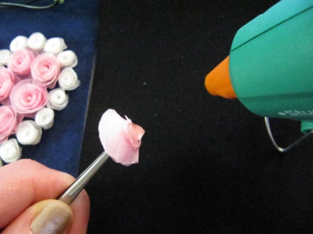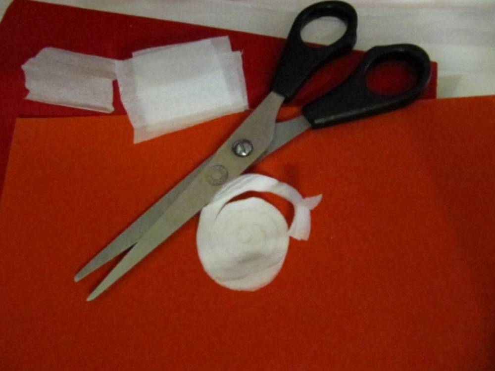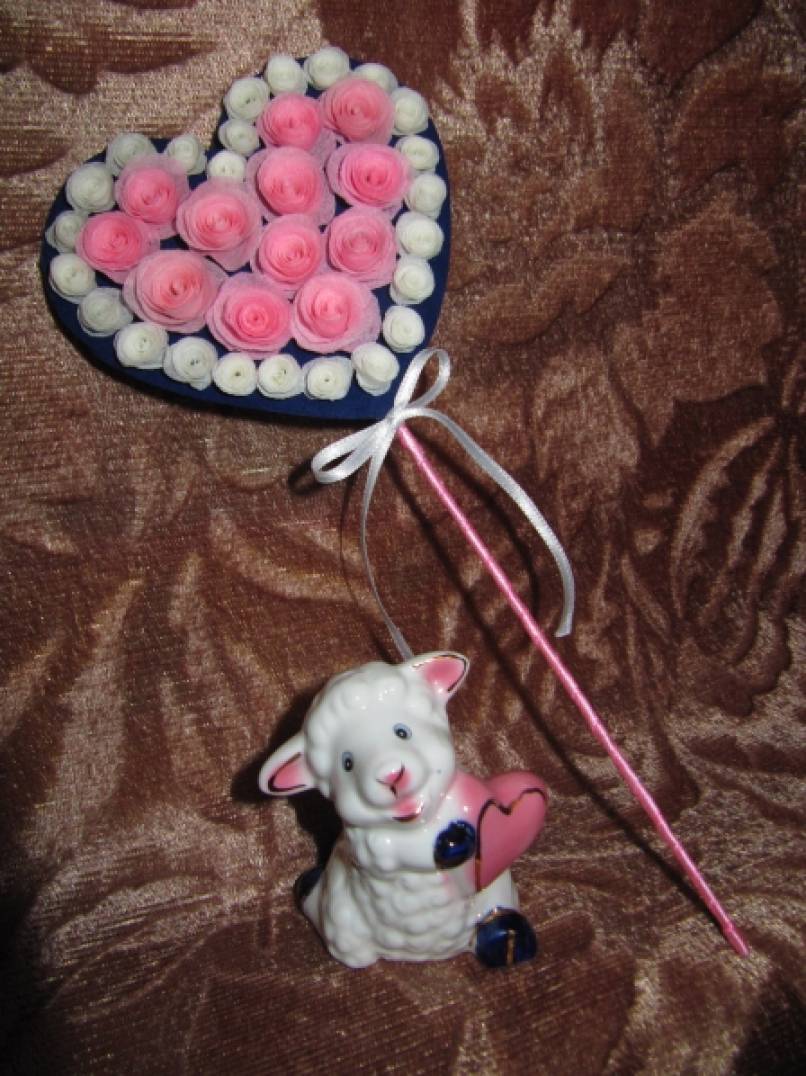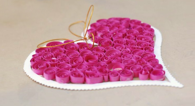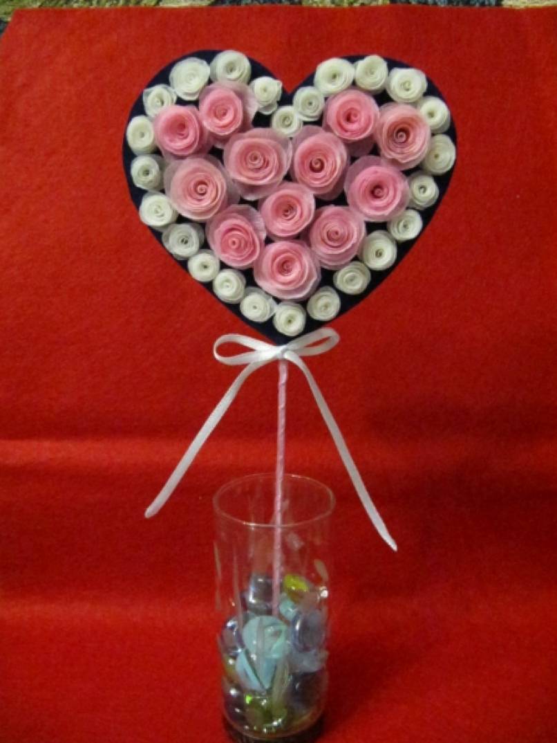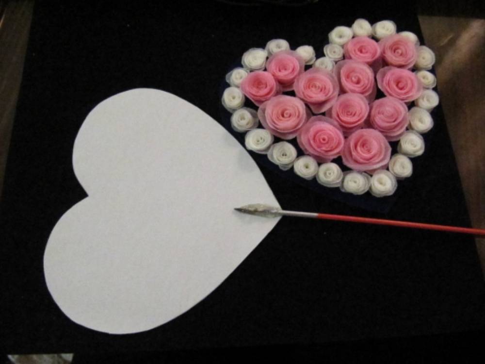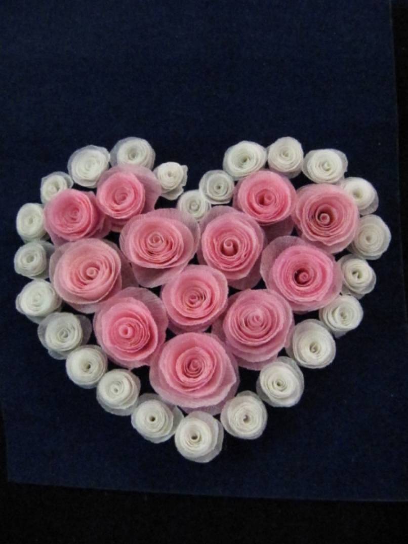 На палочку или зубочистку скручиваем полученную ленточку от начала к середине. Таким образом, получаем «спиральную» розочку. Из розочек составляем сердечко.