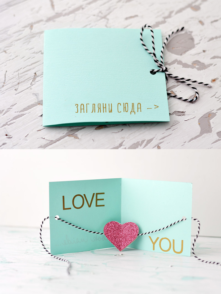 - Остался последний штрих – из черной бумаги вырезаем полоску, белой ручкой пишем на ней признание в любви и приклеиваем в нижней части открытки.
