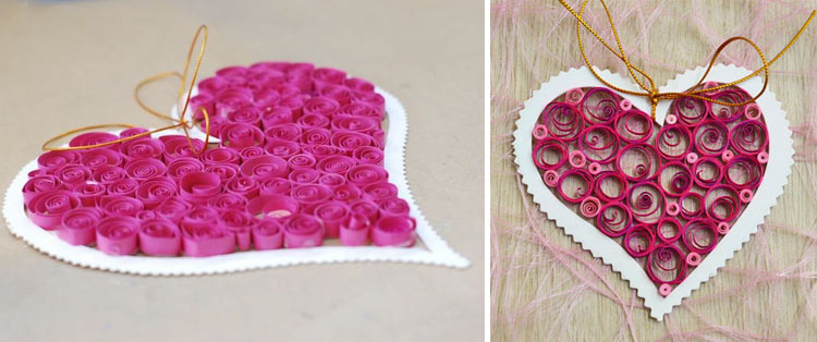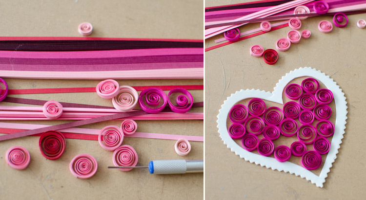 - С помощью зубочистки, шила или специального инструмента для квиллинга каждую полоску скручиваем и полученные завитушки распределяем внутри сердца.
