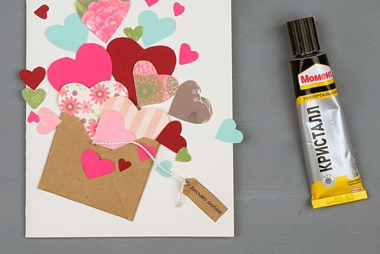 - Из цветной бумаги вырезаем небольшие сердечки и в произвольном порядке приклеиваем их в центр открытки.