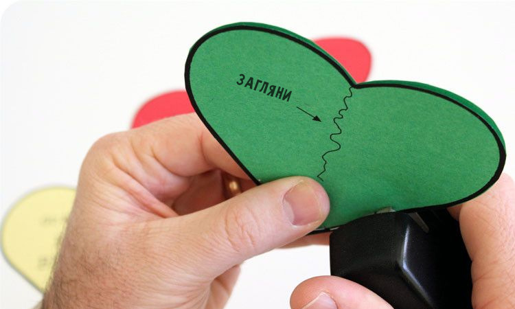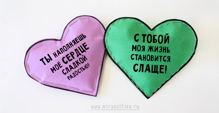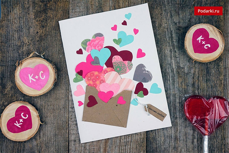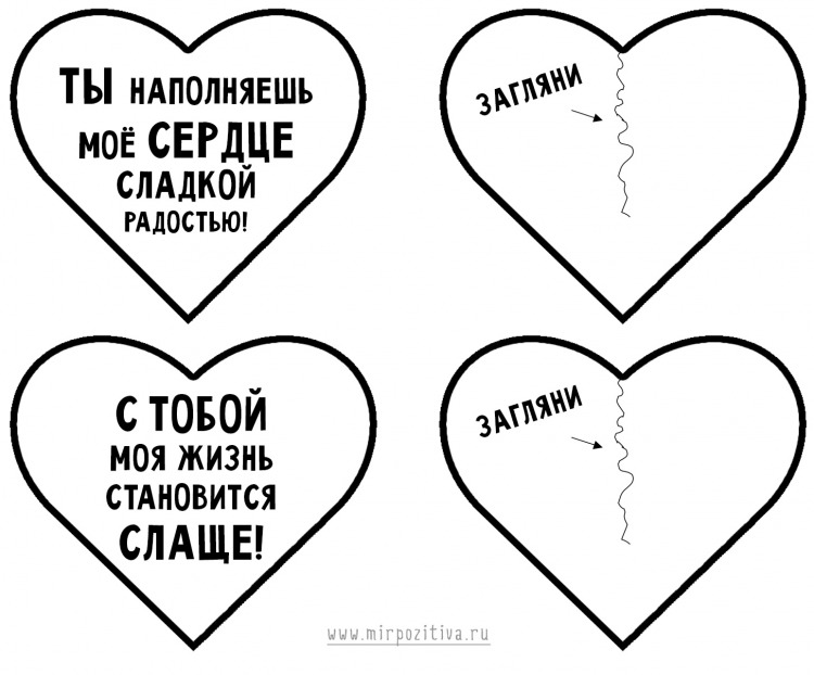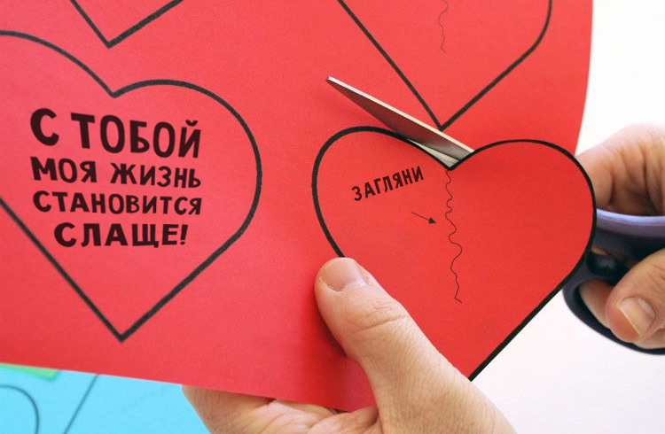 Можно на каждом из сердечек написать слова, которые по мере вытаскивания сердечек будут складываться в фразу. Не перепутайте начало и конец при вкладывании послания в конверт, а то получится «Люблю тебя, я — Зина» вместо «Зина, я тебя люблю»:)
