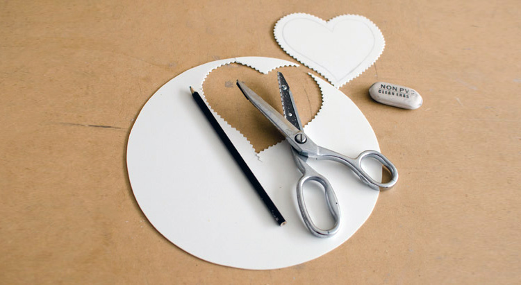 - Берем обычный белый картон и рисуем на нем сердце любой формы и величины. Используя фигурные ножницы, вырезаем деталь по контуру.