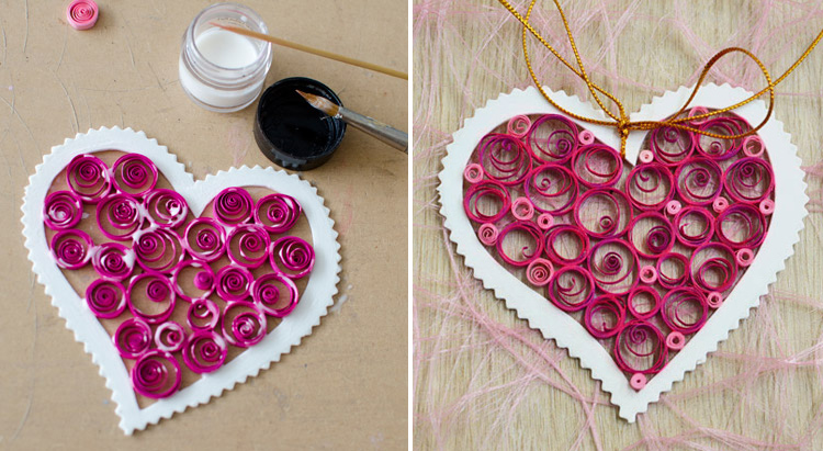Из бумажных полосок при помощи зубочисток скрутите спиральки. Они могут быть разного размера и цвета. Готовые спиральки укладывайте внутрь картонного сердца-основы и скрепляйте между собой ПВА.