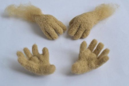 Теперь делаем лапки. Они состоят из основ (ладошек и ступней) и пальчиков. Ладошки — продолговатые, пушистые с двух сторон заготовки. А у ступней нужно сформировать закругления пяточек и выпуклости подушечек. Каждый пальчик валяется отдельно, одна сторона его оставляется пушистой.