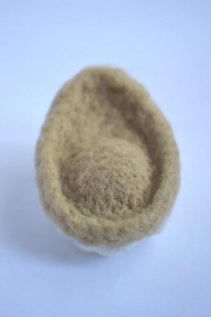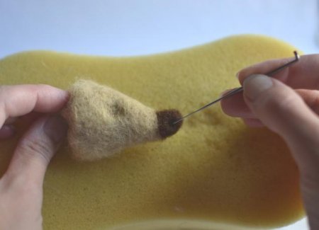 Для этого берем шерсть бежевого цвета, накручиваем на палец, формируя конус, после чего валяем, сохраняя форму.