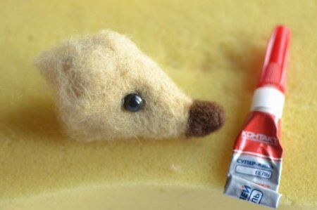 Берем маленький кусок темно-коричневой шерсти и делаем ежу мордочку — прикладываем к туловищу и оконтуриваем так же, как носик.