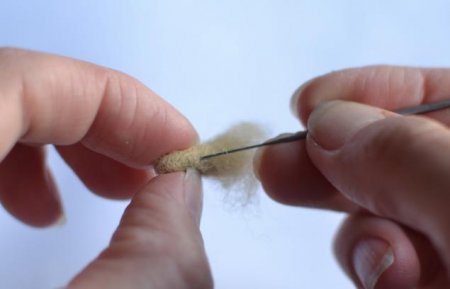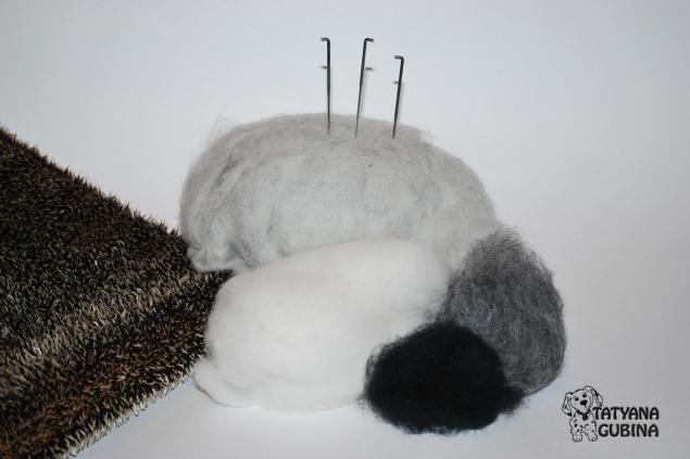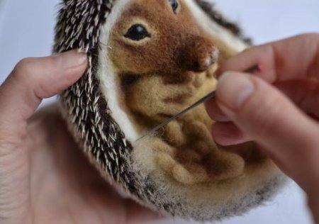 Накладывая по всей поверхности игрушки распушенные кусочки молочной шерсти, отшлифуйте ежика тонкой иглой.