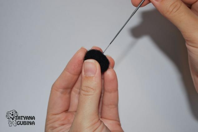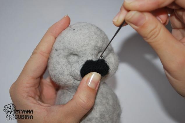 8. Берём небольшое количество черной шерсти – это будет нос и приваливаем его к мордочке.