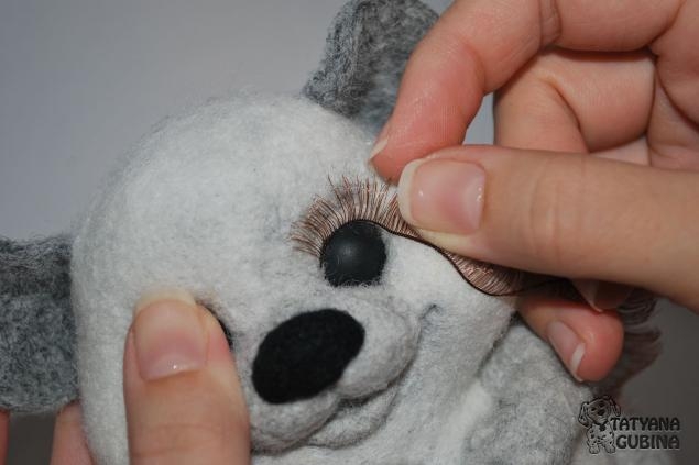 Когда все веки готовы, приваливаем их к глазницам. Мордочка в районе носа и ближе к глазам слегка затемняется – приваливаем туда темно-коричневую шерсть.