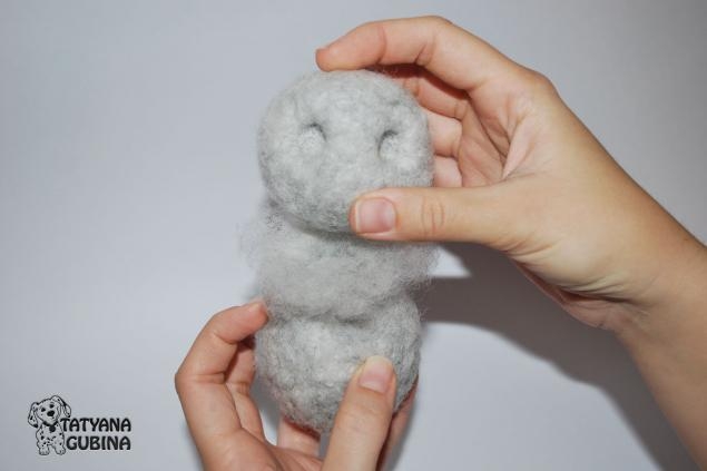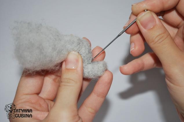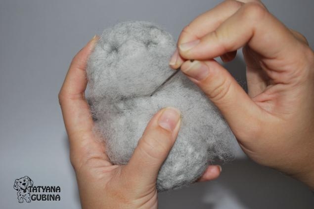 Берем небольшое количество серой шерсти, скручиваем валик и придаем ему форму нашей будущей игрушки.