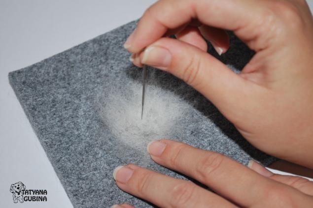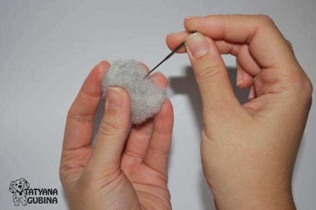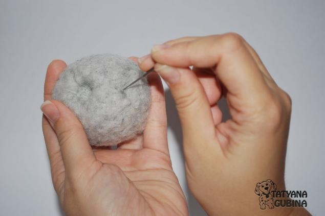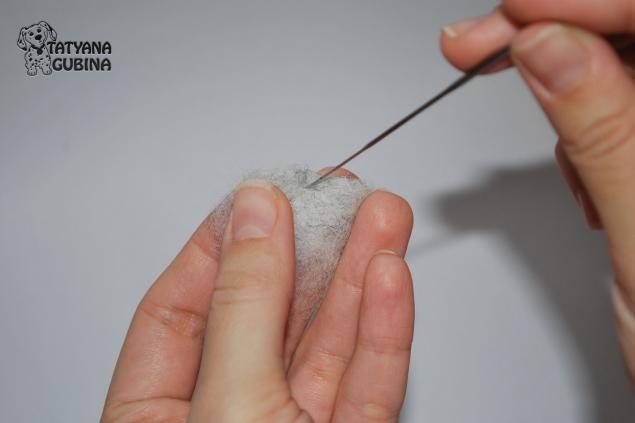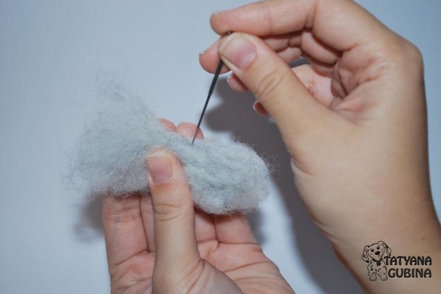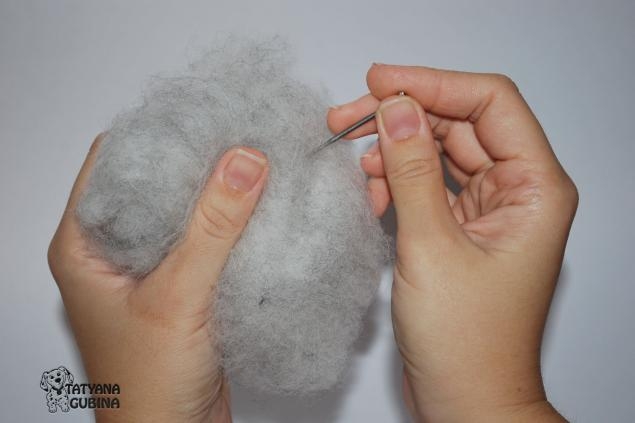 1. Для начала нам нужно распушить шерсть белого цвета, сформировать мячик и начинать валять грубой иглой № 36. Иглу нужно вводить глубоко.